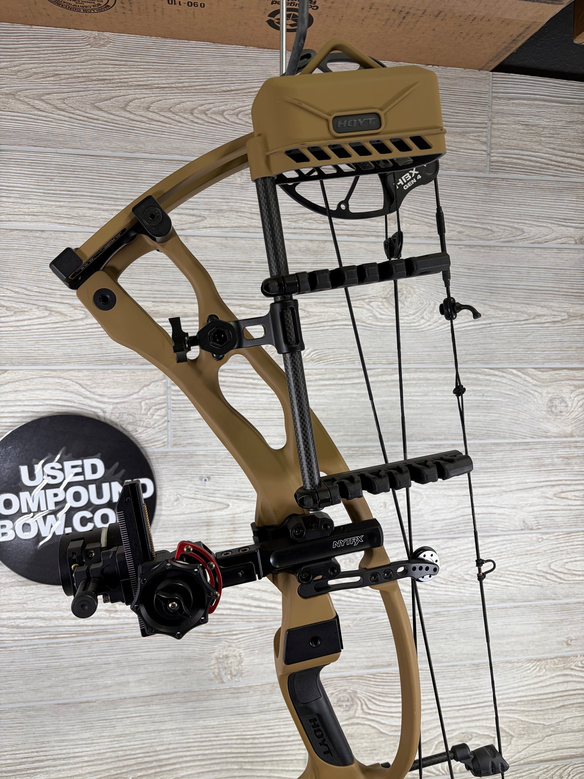 Bow is in great condition. Bow is new, was setup as show demo. Has not even been drawn yet. Bow comes with 6 Arrow Hoyt Superlite QD Bourbon Quiver, HHA Nytrx DT 3 Pin Sight, Peep sight and D-loop. The accessories are brand new also, but I do not have the packaging for them. I do not have the sight tapes for the sight, only the setup tape that is on it from factory.